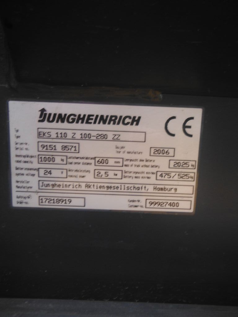 Hersteller: Jungheinrich Typ: EKS 110 Z 100-280 ZZ Bauart: Hochhubkommissionierer Antriebsart: Elektro Tragkraft: 1000 kg Zustand: gut |